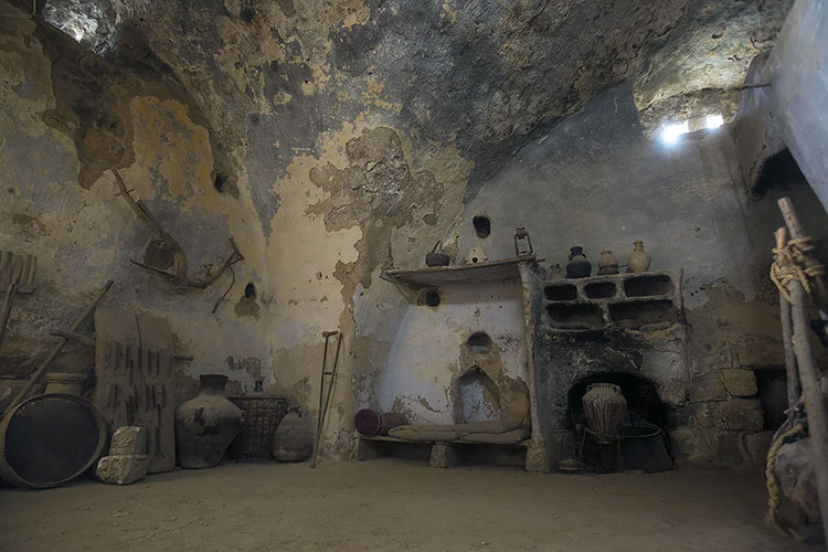 La pierre de seuil sous la porte d’entrée est légèrement creusée pour laisser passer une main qui, si elle porte un signe de reconnaissance, un tatouage par exemple, sera acceptée par les habitants à l’intérieur : « Mon bien-aimé a passé la main par la fente… je me suis levée pour ouvrir à mon bien-aimé. » (Ct 5,4-5) Dès la porte franchie s’ouvre un double espace, un rez-de-chaussée bas de plafond, lui-même séparé en deux pièces et un étage que l’on gagne par un petit escalier monté juste en face de la porte. Le petit « sous-sol » sombre servait de remise et de bergerie pour un ou deux ovins ou caprins, parfois un âne, qui apportaient leur chaleur à toute la maison en hiver.