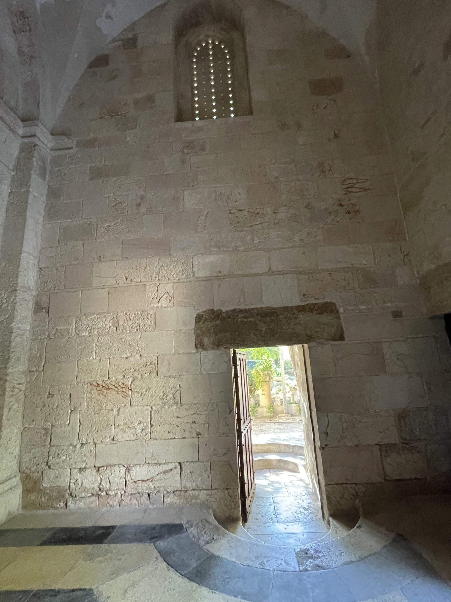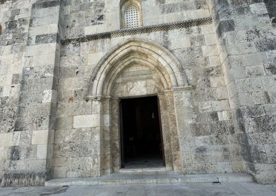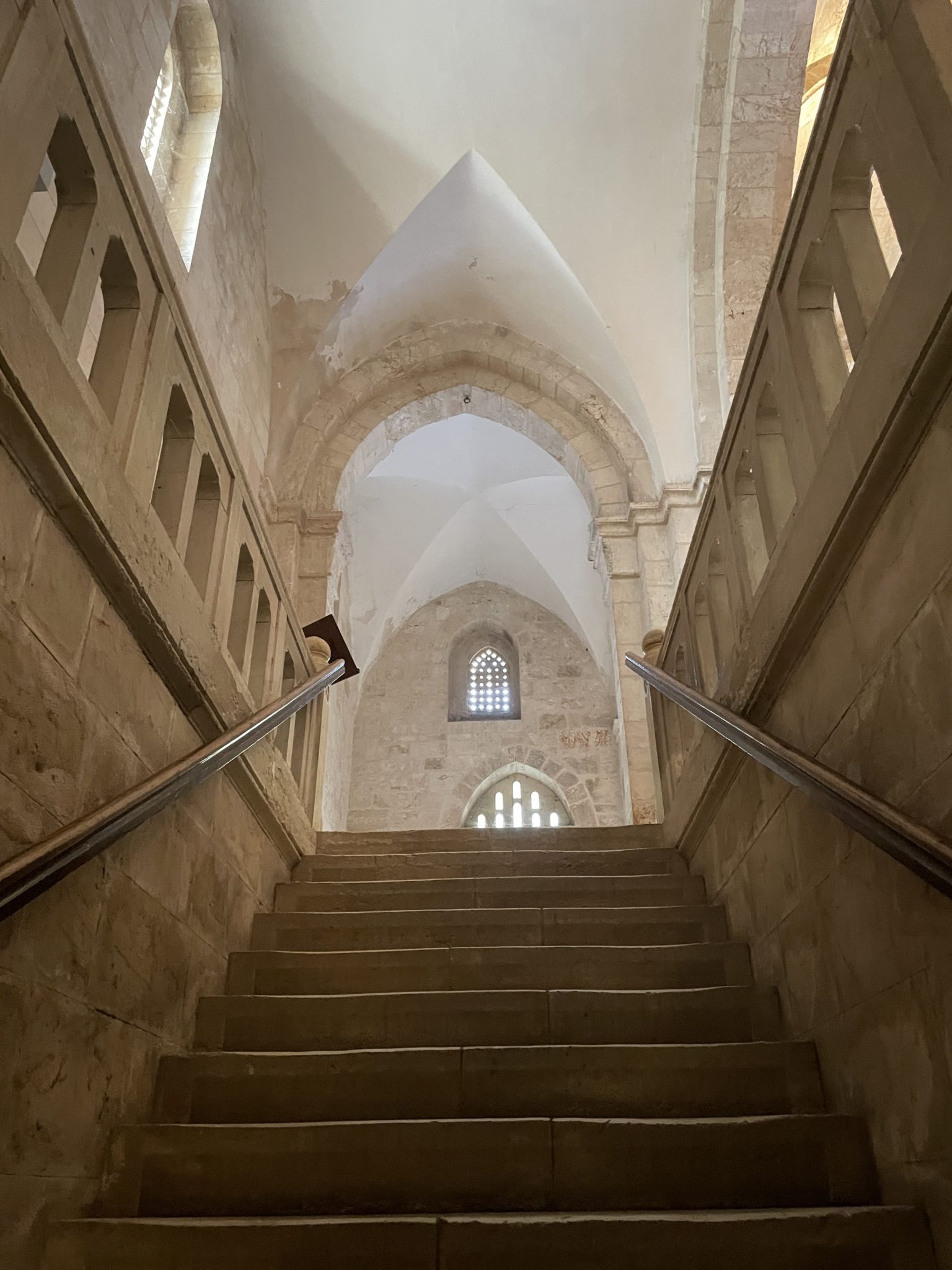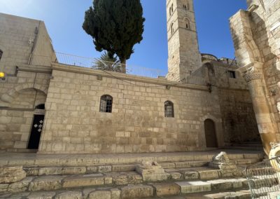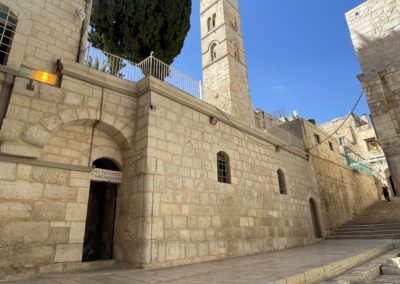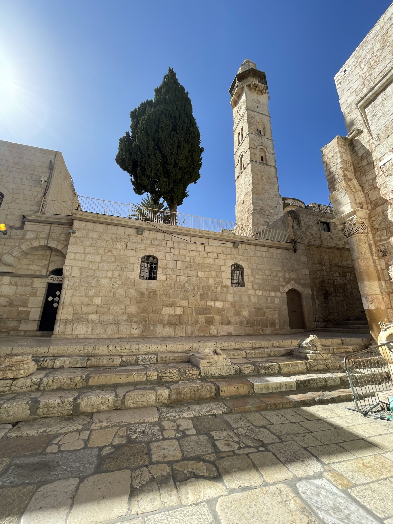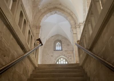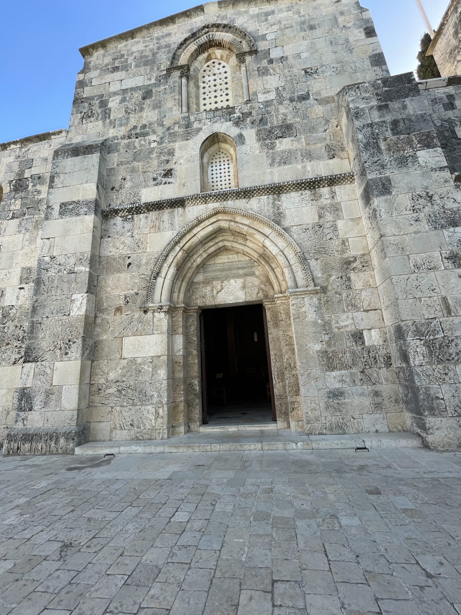 Nous nous sommes ensuite rendus à l’église Sainte Anne, située à Jérusalem Est dans la Vieille Ville. Elle est administrée par les Pères blancs et elle se trouve juste à côté du site archéologique de la piscine de Bethesda du Nouveau Testament. Selon la tradition chrétienne orientale, la crypte est située sur le lieu de la maison d’Anne et Joachim, les parents de la Vierge Marie à Jérusalem, dans laquelle elle serait née. L’église actuelle, de style roman, a été construite par les croisés en 1140 et a tout de suite été dédiée à sainte Anne. Après la conquête de Jérusalem par Saladin, l’église est transformée en 1192 en école de droit coranique, puis tombe en ruines au cours des siècles. En 1856, après la guerre de Crimée, la France reçut l’église du Sultan Abdülmecid Ier en remerciement de son aide à la Turquie. Sainte-Anne fut donc restaurée et l’État français la confia en 1877 à Monseigneur Lavigerie et à sa Société des missionnaires d’Afrique.