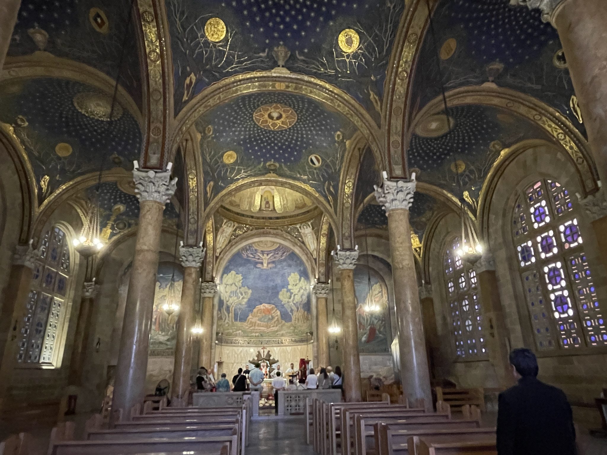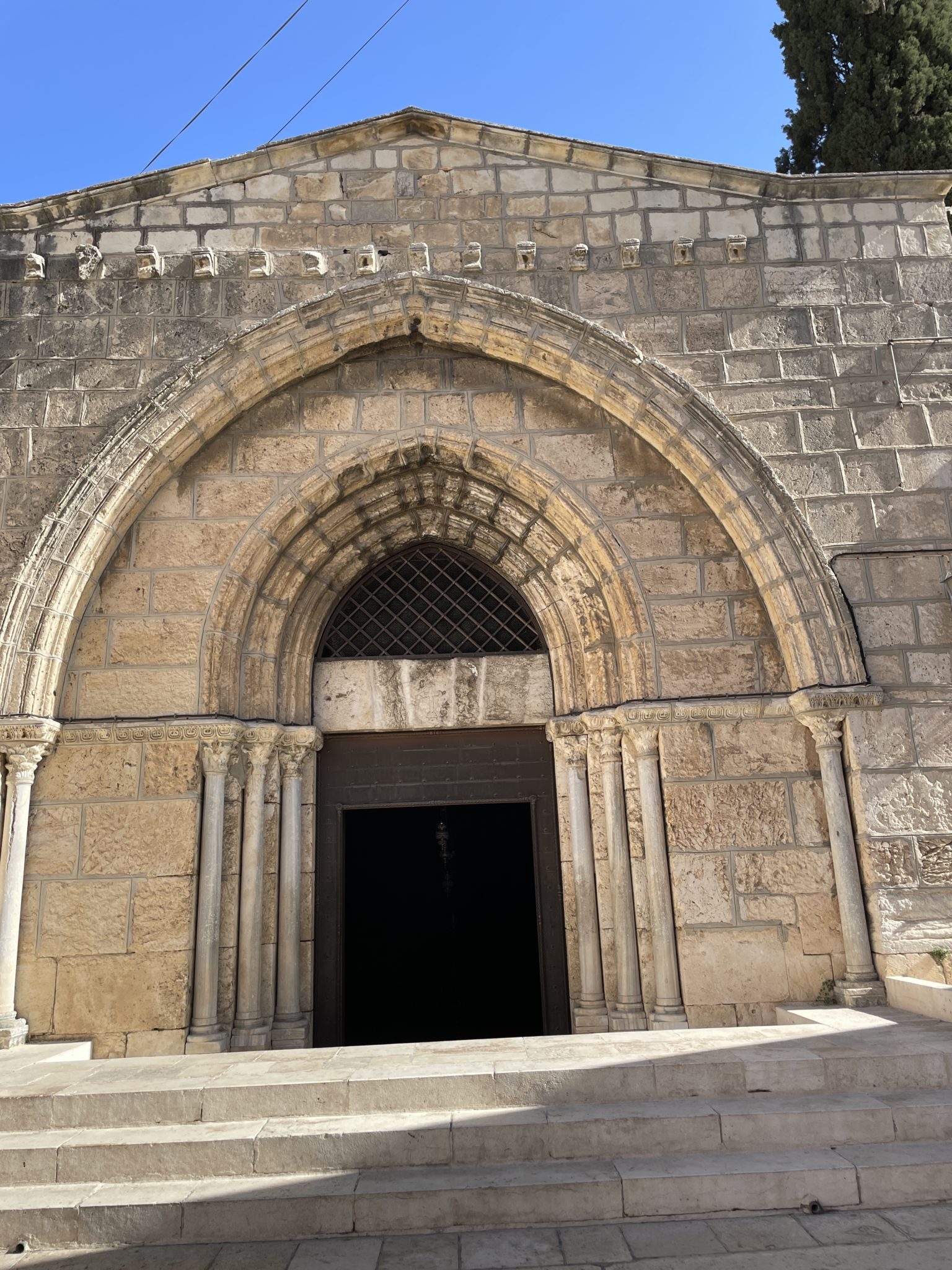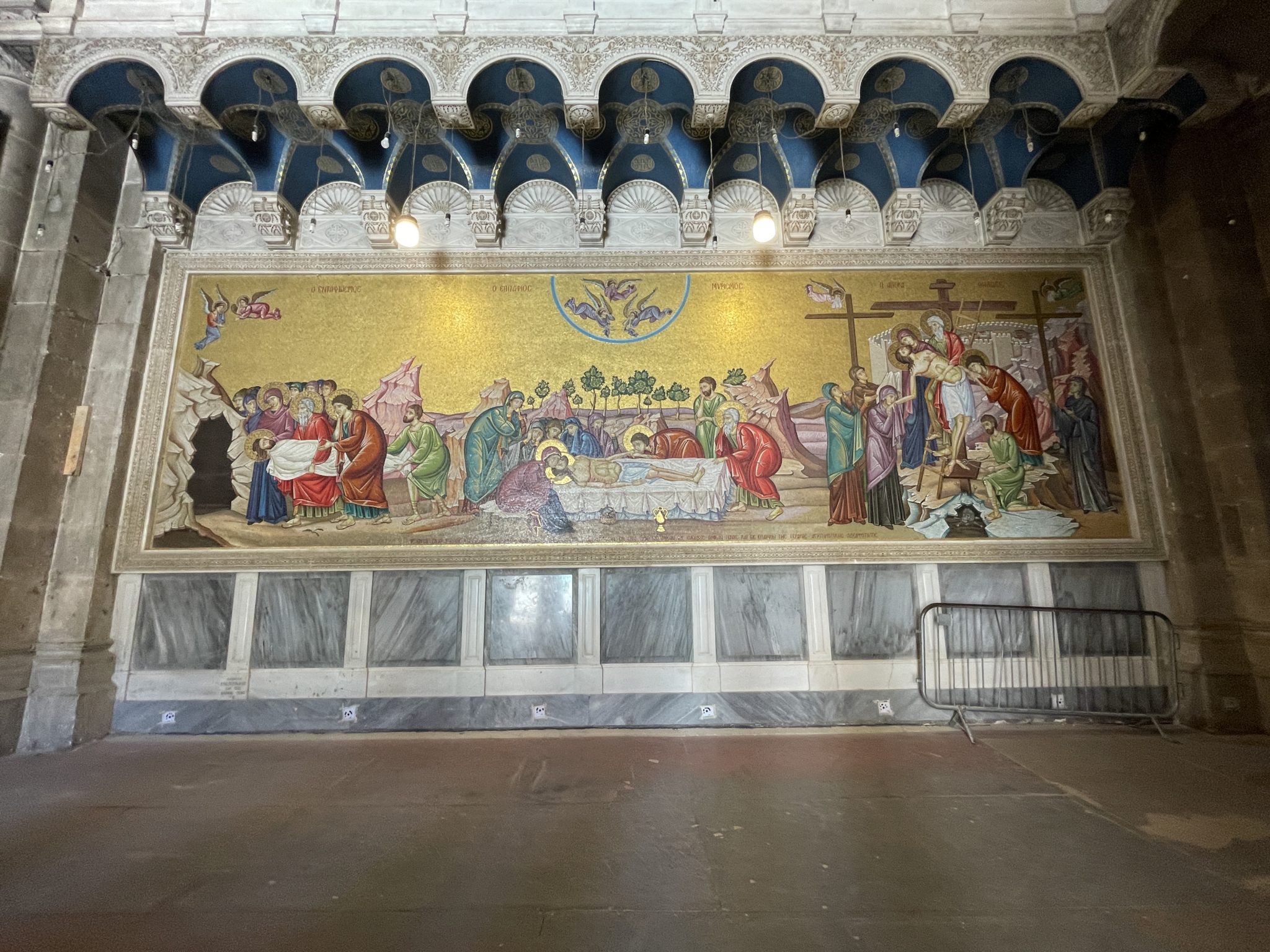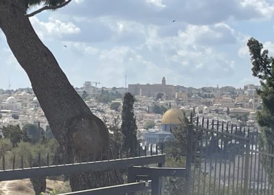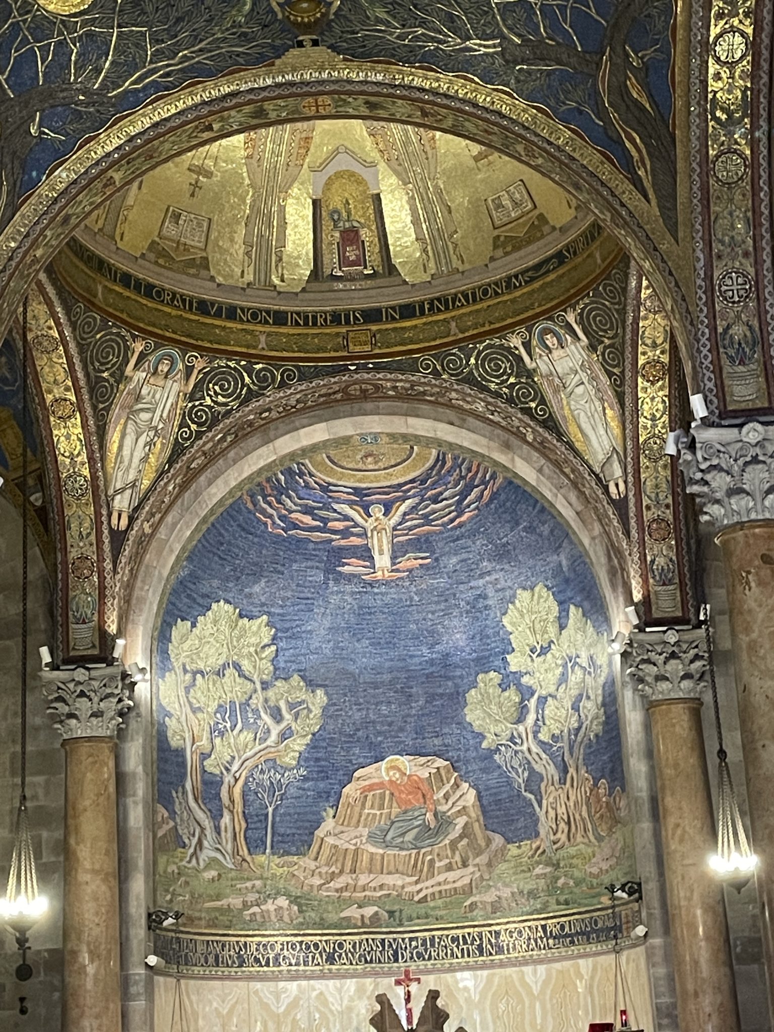 Notre journée à Jérusalem a commencé par le Jardin de l’Agonie et la Basilique. Construite de 1922 à 1924, la basilique renferme le rocher au pied duquel, selon la tradition, Jésus pria durant son agonie avant son arrestation (Luc 22 :41) Le narthex de la basilique est surmonté d’un fronton orné d’une large mosaïque moderne montrant le Christ comme médiateur entre Dieu et les hommes. L’architecte de l’église est l’Italien Antonio Barluzzi. Comme beaucoup d’autres lieux saints en Terre Sainte, la gestion et l’entretien de cette basilique sont entre les mains des franciscains.