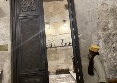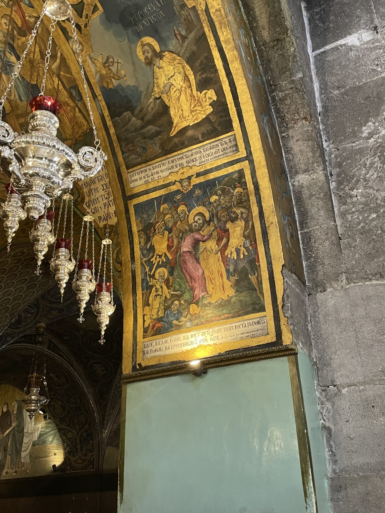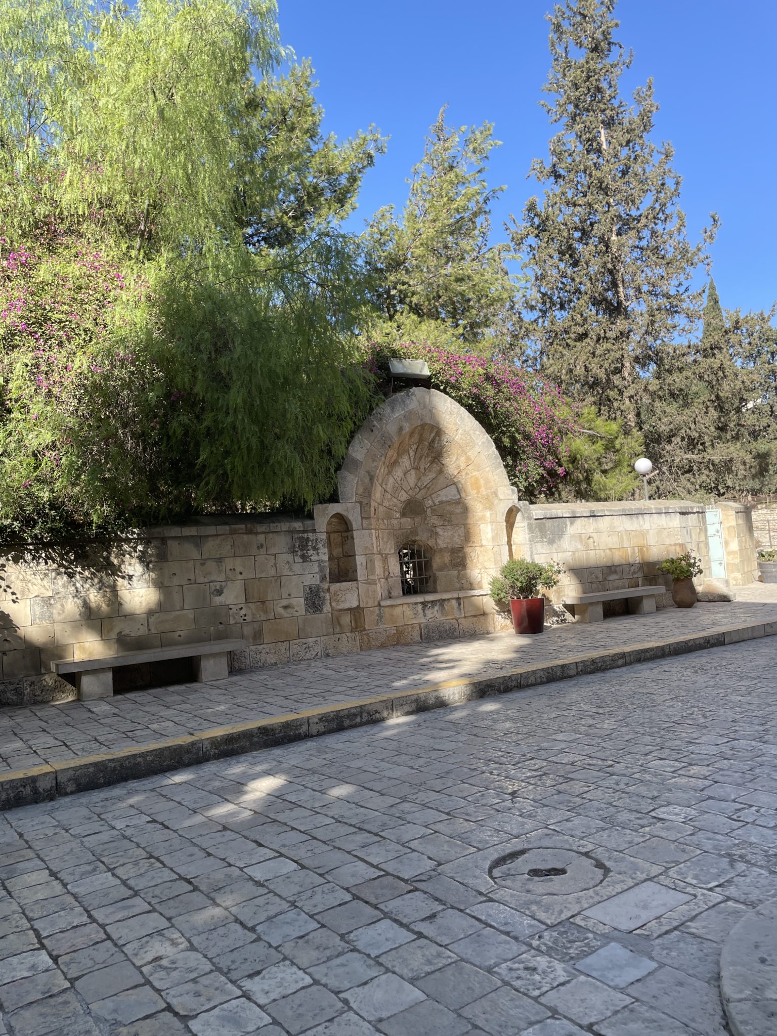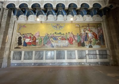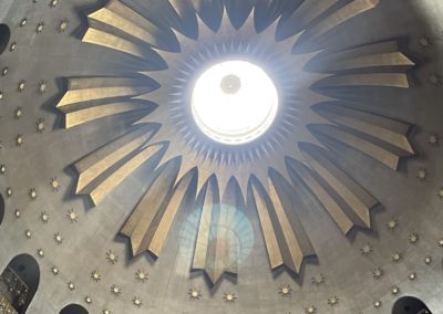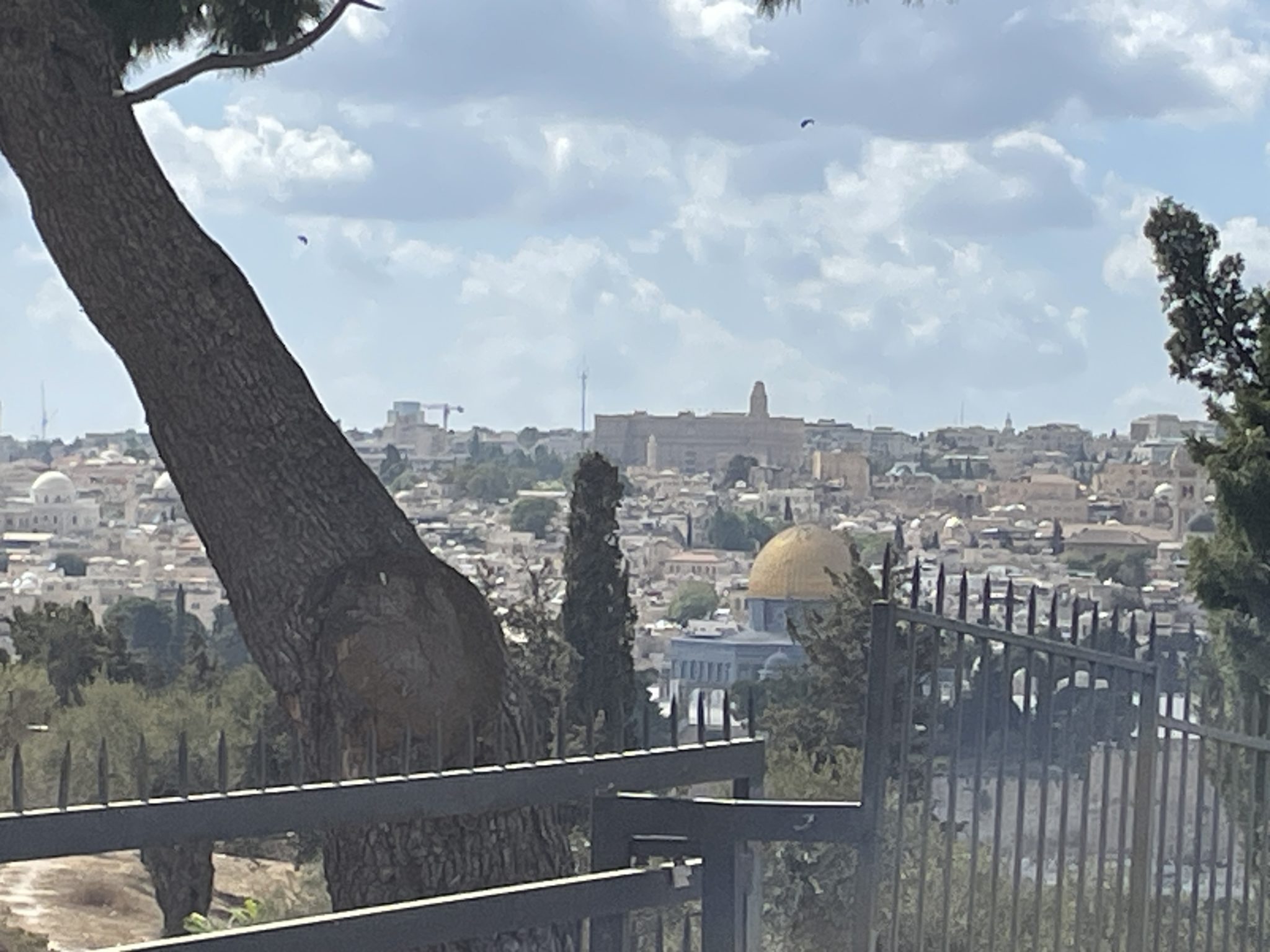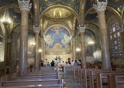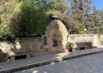Notre journée à Jérusalem a commencé par le Jardin de l’Agonie et la Basilique. Construite de 1922 à 1924, la basilique renferme le rocher au pied duquel, selon la tradition, Jésus pria durant son agonie avant son arrestation (Luc 22 :41) Le narthex de la basilique est surmonté d’un fronton orné d’une large mosaïque moderne montrant le Christ comme médiateur entre Dieu et les hommes. L’architecte de l’église est l’Italien Antonio Barluzzi. Comme beaucoup d’autres lieux saints en Terre Sainte, la gestion et l’entretien de cette basilique sont entre les mains des franciscains.