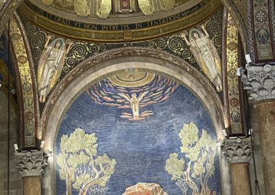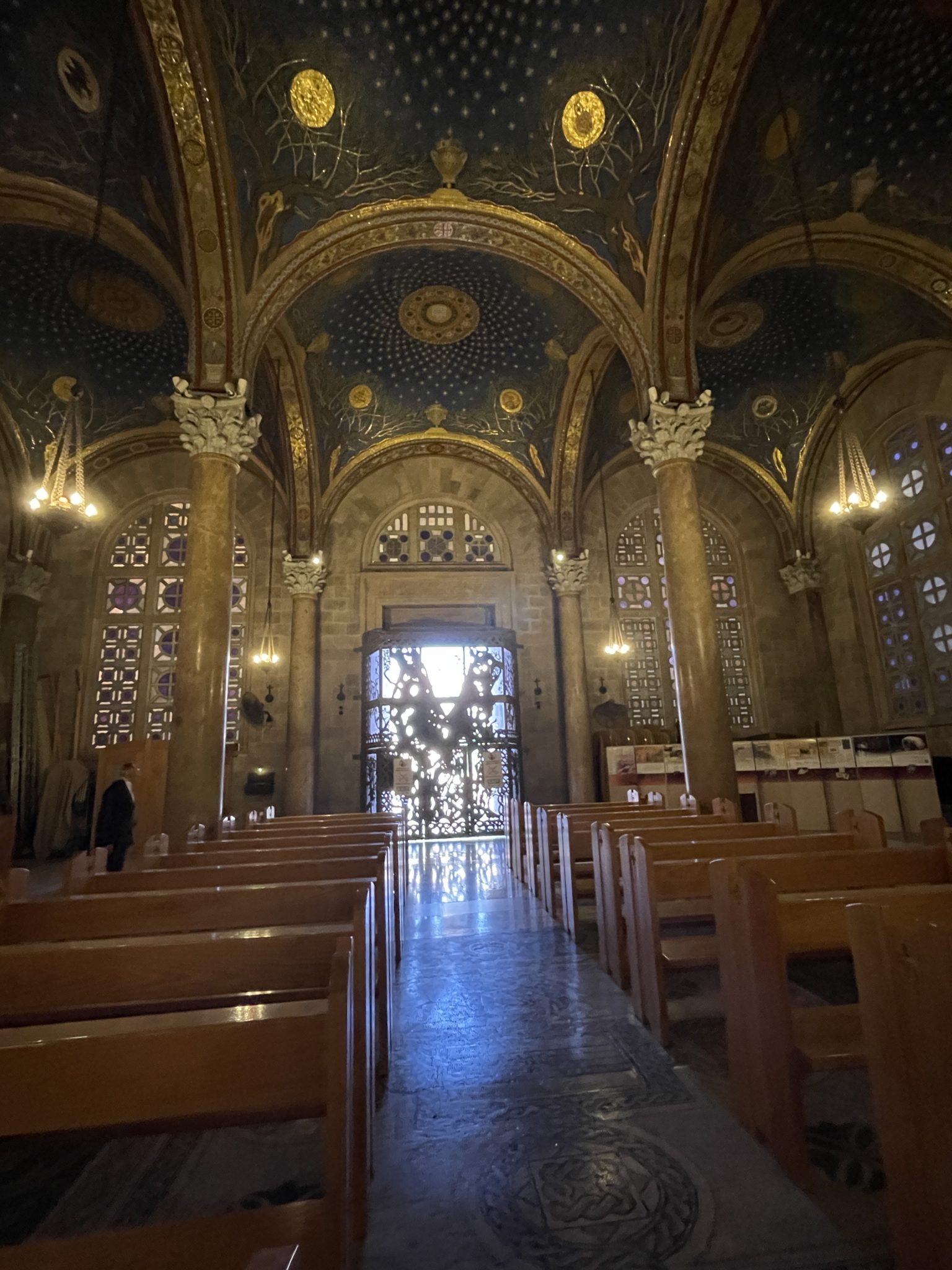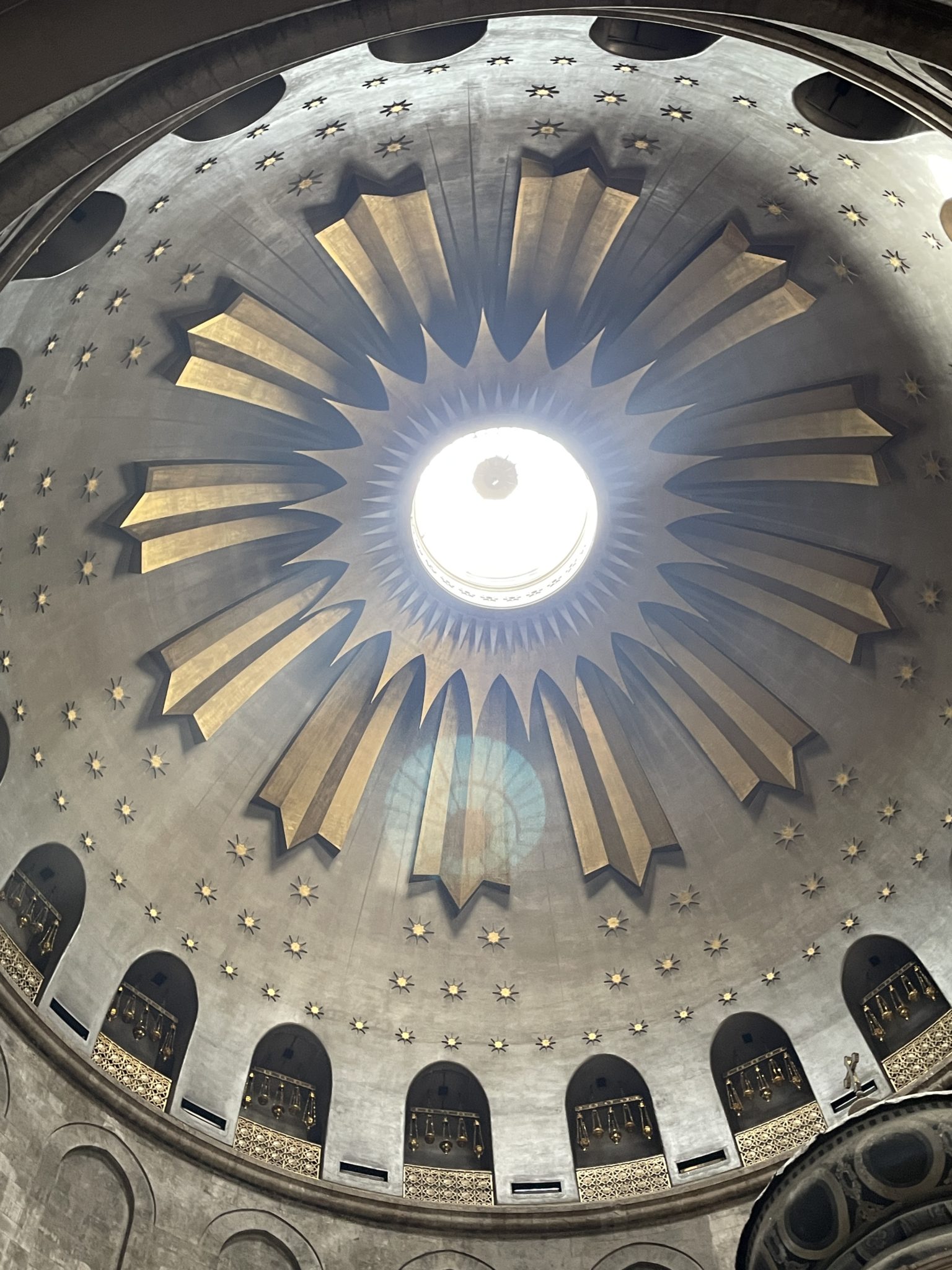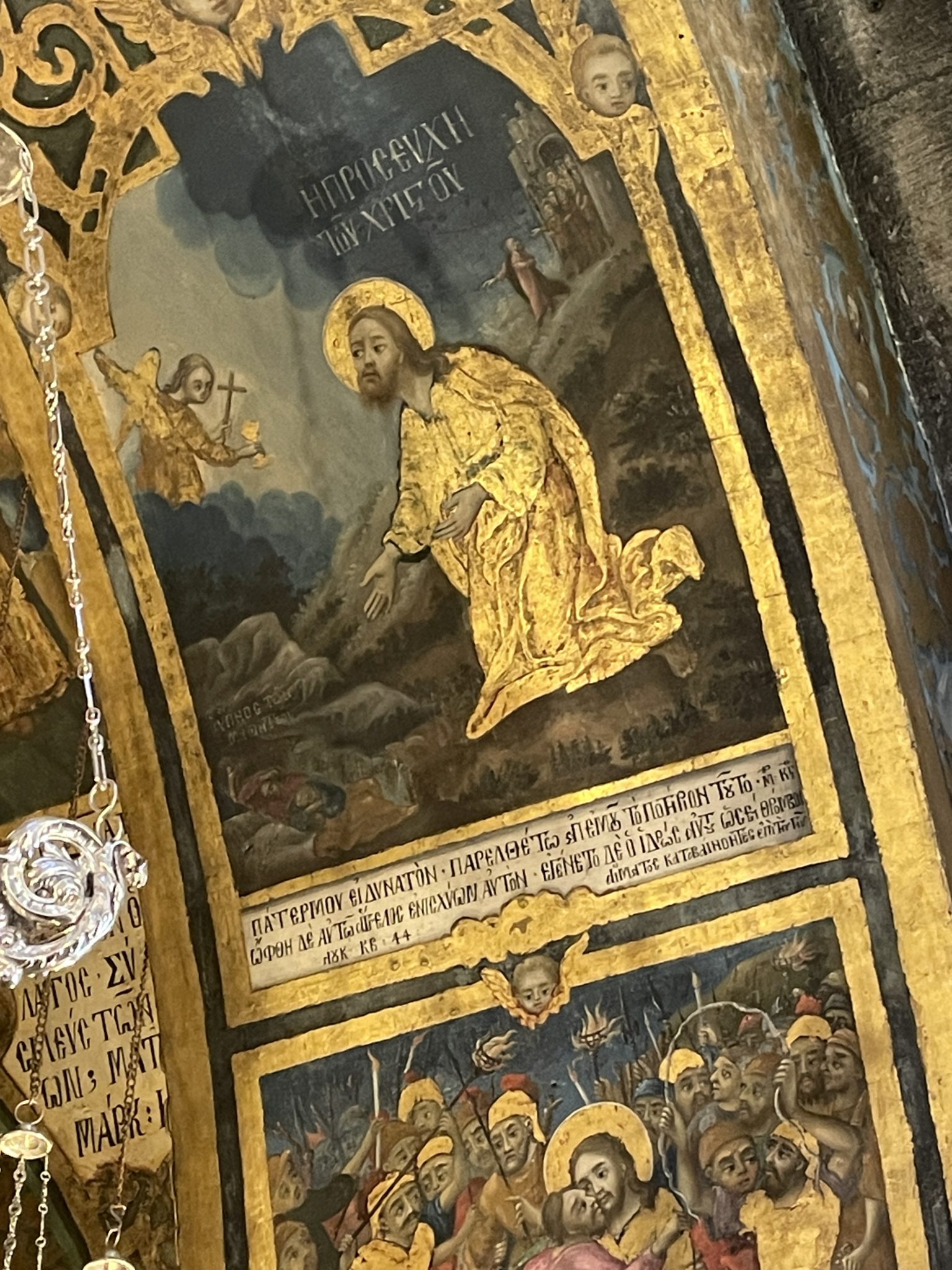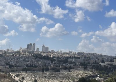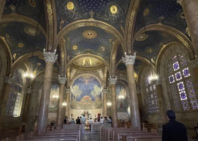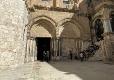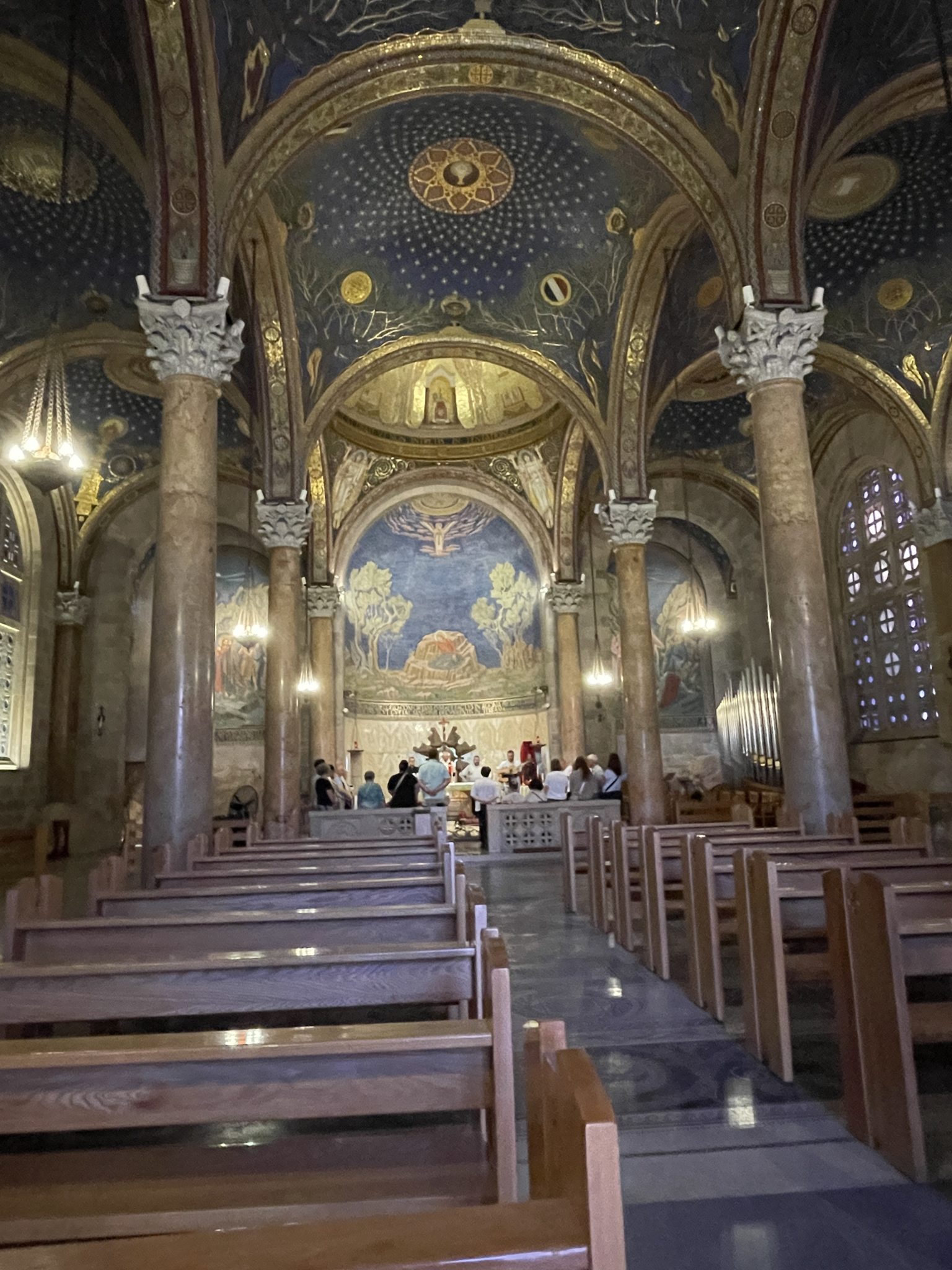 Notre journée à Jérusalem a commencé par le Jardin de l’Agonie et la Basilique. Construite de 1922 à 1924, la basilique renferme le rocher au pied duquel, selon la tradition, Jésus pria durant son agonie avant son arrestation (Luc 22 :41) Le narthex de la basilique est surmonté d’un fronton orné d’une large mosaïque moderne montrant le Christ comme médiateur entre Dieu et les hommes. L’architecte de l’église est l’Italien Antonio Barluzzi. Comme beaucoup d’autres lieux saints en Terre Sainte, la gestion et l’entretien de cette basilique sont entre les mains des franciscains.