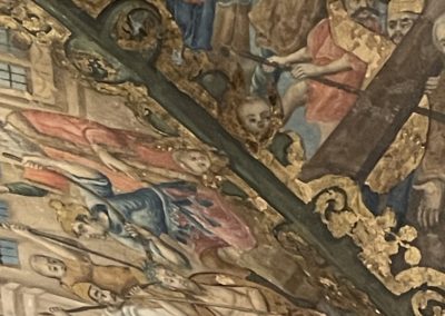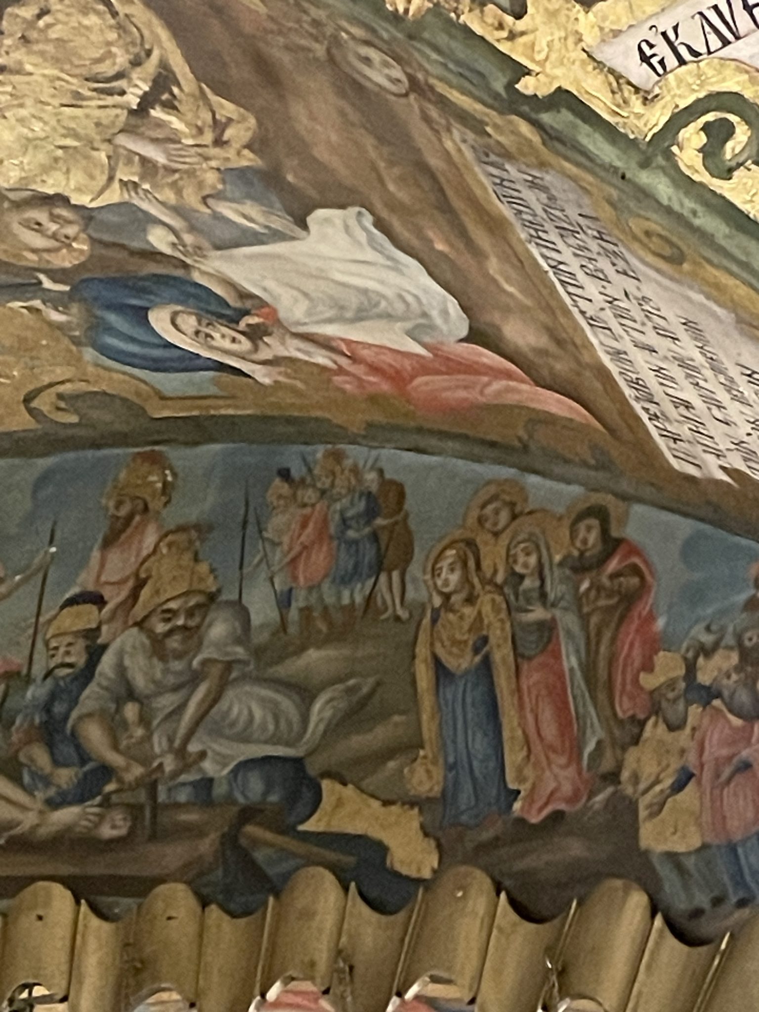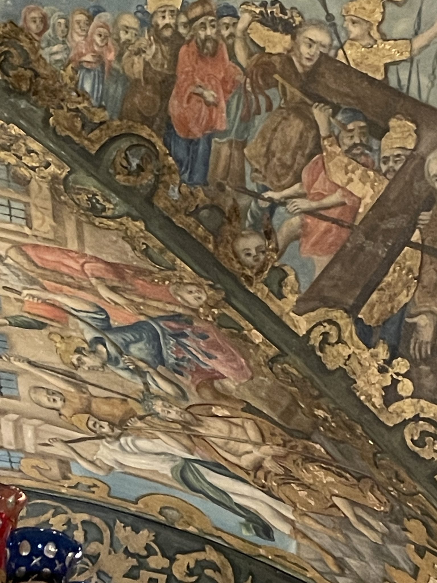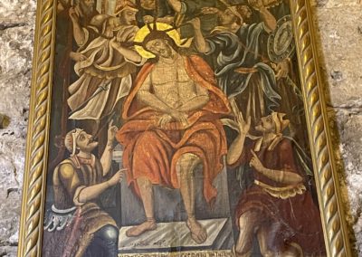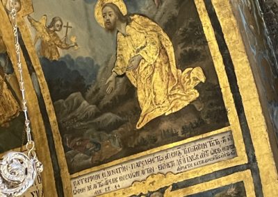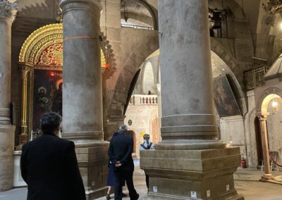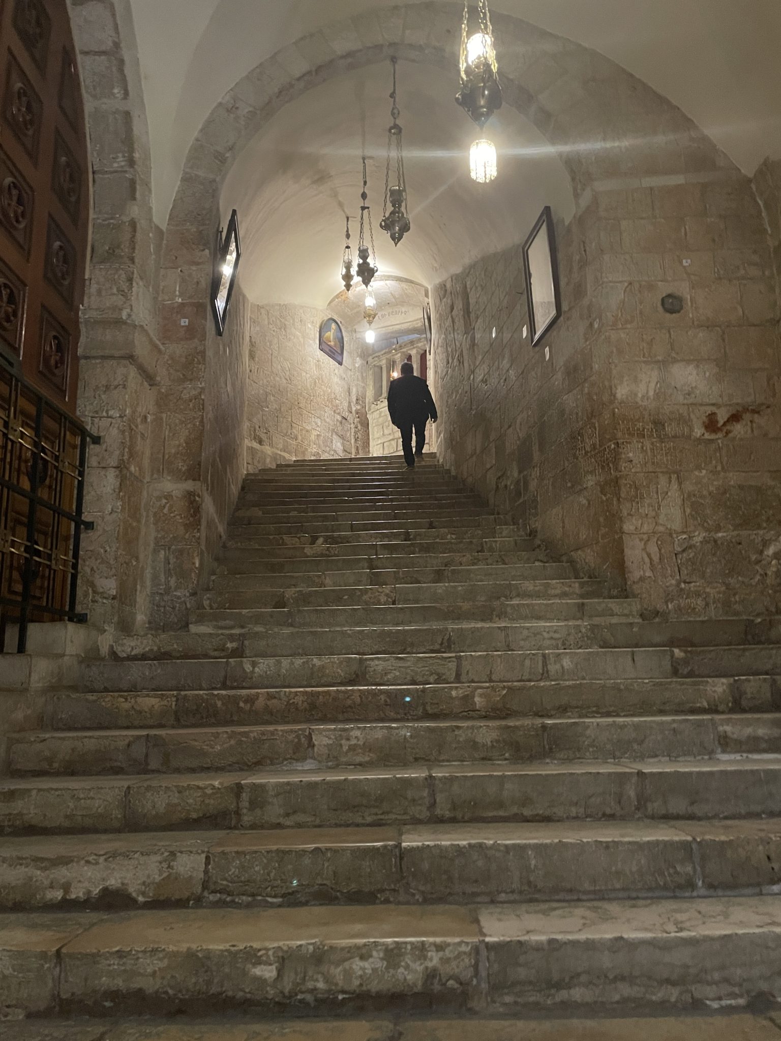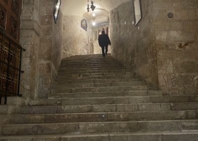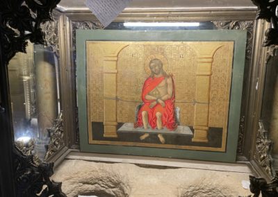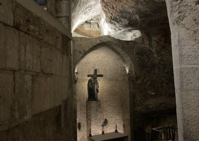 à droite de la Pierre de l’Onction, des escaliers en pierre mènent à une salle surélevée, représentant le Mont Golgotha où Jésus a été crucifié. Le grand rocher où tout s’est passé est protégé par un cristal et est très vénéré par les chrétiens.