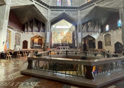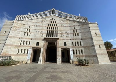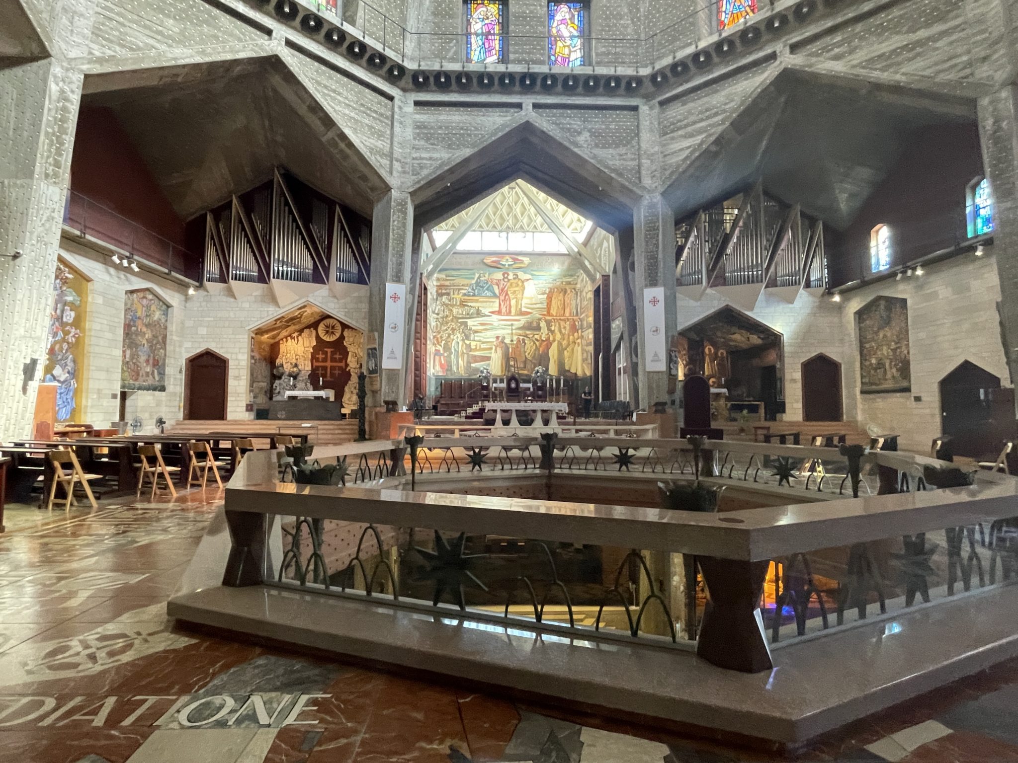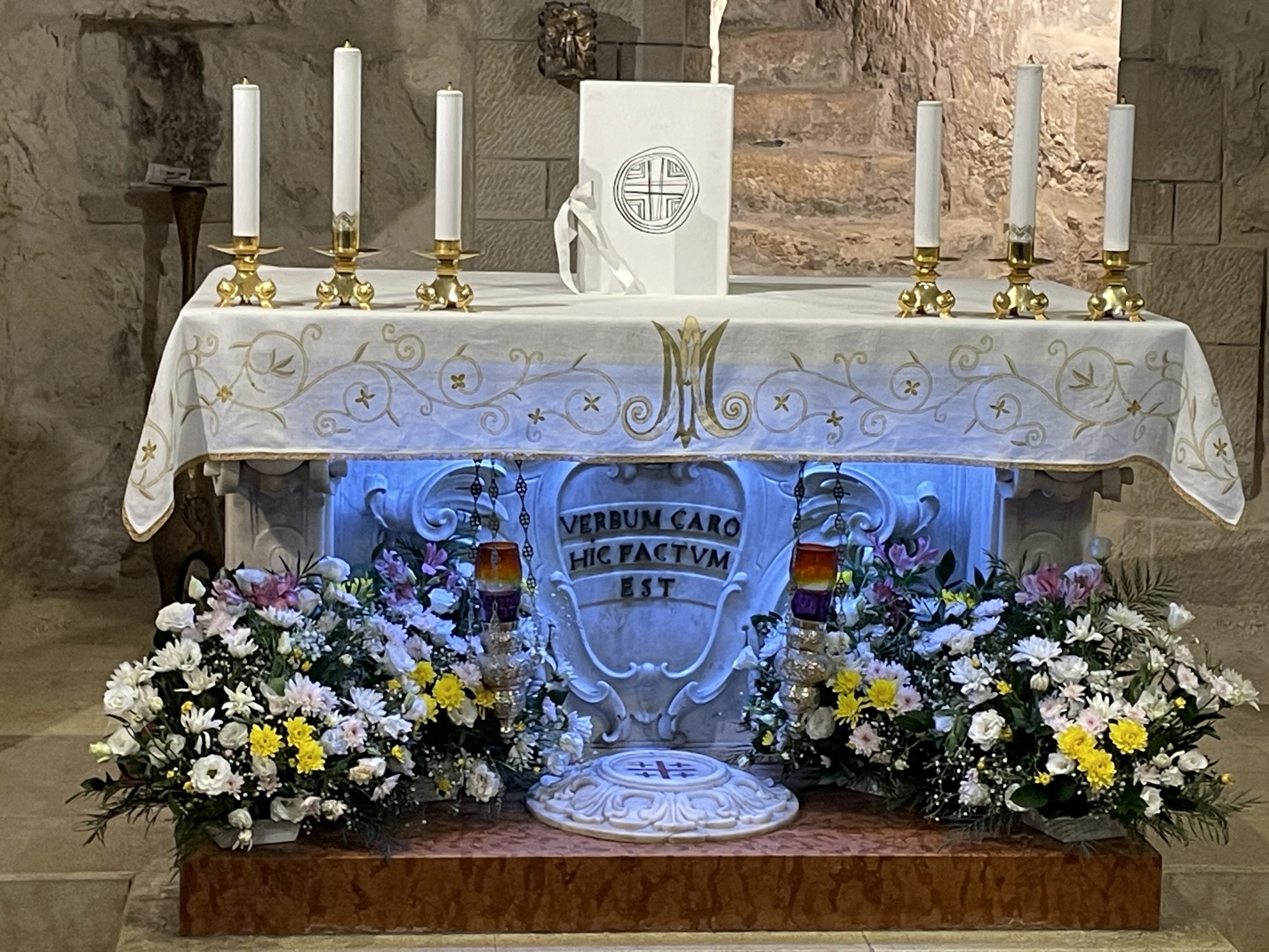 La basilique, construite sur des fondations antiques par l’architecte Giovanni Muzio, a été inaugurée en 1964 par le pape Paul VI et consacrée en 1969. Elle fait partie du domaine des Franciscains et c’est la plus grande des églises du Moyen-Orient. Elle est constituée de deux églises superposées. Dans celle située au niveau inférieur, se trouve la « grotte de l’Annonciation », où Marie aurait vécu. Dans l’église à l’étage, où se réunit la communauté chrétienne catholique de Nazareth, ainsi que sur le mur d’enceinte du parvis de la basilique, on peut admirer des fresques contemporaines qui proviennent de nombreux pays à travers le monde et représentent la Vierge et l’enfant Jésus.